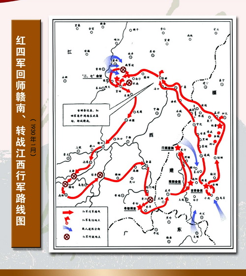 1929年12月 28---29日,中國工農紅軍第四軍在福建省上杭縣古田鎮溪背村曙光小學召開了具有重大歷史意義的第九次全軍黨的代表大會。這次代表大會,就是著名的古田會議。 古田會議前后,為了消滅我入閩紅軍主力,撲滅閩西蘇區革命烈火,國民黨反動派調集了閩、粵、贛三省反動軍隊共 12個團的兵力,以贛敵三十一軍軍長金漢鼎為總指揮,分七路對我閩西蘇區和入閩紅軍實施第二次反革命三省“會剿”。 為了粉碎敵人的“會剿”陰謀,古田會議之后,紅四軍前敵委員會決定兵分兩路,一路由朱德率領紅四軍第二縱隊出擊連城,籌措給養;另一路由毛澤東和總前委率紅二縱隊留駐古田,主動出擊和牽制敵人,待完成任務后趕赴連城與朱德會合,爾后將紅四縱隊留在閩西,其余主力回師贛南、轉戰江西,直搗金漢鼎的老巢,迫其回救,以解閩西之圍。 1930年1月3 日,朱德率紅一、三、四縱隊先期出發,5日到達連城廟前時獲知敵人已向新泉、古田一帶進犯,并與毛澤東及紅二縱隊失去了聯系,于是重新做出決定,率部于 9日進入清流,10日在清流里田鍋蒙山擊破敵地方保衛團馬鴻興部的阻截,殲敵 600余人,順利向寧化挺進。13日再由寧化進入江西石城。 與此同時,毛澤東率紅二縱隊在古田一線完成阻敵任務后,于1月 7日離開古田按原定計劃趕赴連城,中途獲知朱德所部已先期返贛的消息,于是決定轉向,于14 日率部由姑田進入清流,15日經余朋、芹溪、桐坑進入林畬,16 日再由清流的林畬經歸化轉入寧化的安遠,爾后甩開尾隨之敵,西越武夷山進入江西,于1月 23日與朱德所部勝利會師于寧都東韶,順利地實現了回師贛南、轉戰江西的戰略目的,并進而徹底地打破了敵人的第二次三省“會剿”陰謀。 |