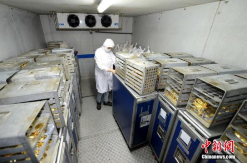 資料圖:預計距離飛機快降落時,工作人員開始將食物裝入送餐車,進入停機坪等待艙門打開,將飛機餐送入機艙中。圖為還沒有配送出去的食物都放在冷藏室。 王東明 攝