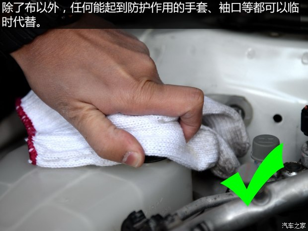 當冷卻液達到正常工作溫度時,正確補充冷卻液方法是先滅車,等待一會后上水管壓力會降低,在非之前的緊繃狀態后,用布或手套之類的東西墊在補充水壺蓋上,慢慢旋轉擰開,到有氣體噴出時停止旋轉,帶到氣體完全釋放后就可以擰開壺蓋,補加冷卻液了。