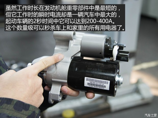 工作時間短但強度很大 題目中說的最懶的確是一個打引號的說法,從工作時長上來說這話的確沒毛病,因為汽車運行99%的時間里它都是休息的狀態,雖然時間考核輸了,但是崗位重要性和工作強度絕對是最狠角色,這個大號水壺般的零件在工作時可以會達到好幾百安(一般起動機可以達到200-400A)的瞬時電流,這個瞬時電流可以秒殺一切車載用電器了,如果腦子里對這個數字概念不太明晰的話,看一下家用電器的額定電流感覺就明顯了,加熱類的大型家用用電器的瞬時啟動電流也不過幾十安。