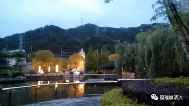 亭臺樓榭曲徑連, 竹木成蔭水盈盈。 圣人偉像中屹立, 笑看花間蝶翩翩。