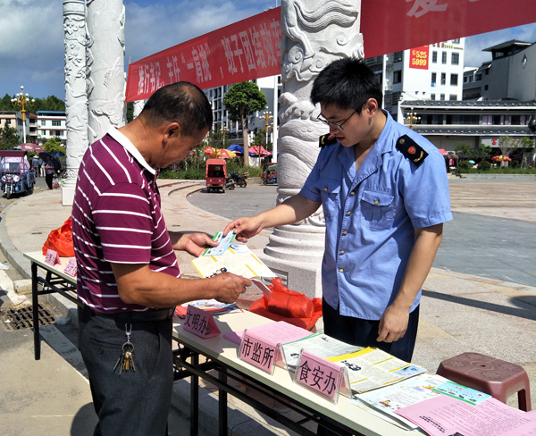 7月25日,主題為“尚德守法 食品安全讓生活更美好”的食品安全宣傳周活動在嵩溪廣場拉開序幕。鎮食安辦、市監所、安監站、扶貧辦、衛計辦、組織室等部門10人參加宣傳活動。