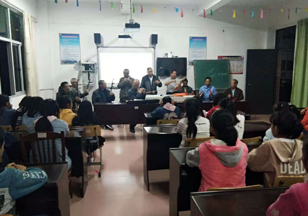 11月8日晚,清流縣長校鎮省級非物質文化遺產“十番鑼鼓”演奏團一行10人到長校中學,為七、八年級學生又上了一堂別開生面的鄉音大餐。據悉,為更好地繼承和弘揚長校鎮的優秀傳統文化,自2017年起,清流縣長校中學和清流縣長校鎮民間藝術隊聯手打造“十番鑼鼓進校園”和“十番鑼鼓進班級”活動,學校定期邀請“十番鑼鼓”演奏團成員到學校演奏,為同學們傳授“十番鑼鼓”知識,手把手教同學們各種器樂演奏。