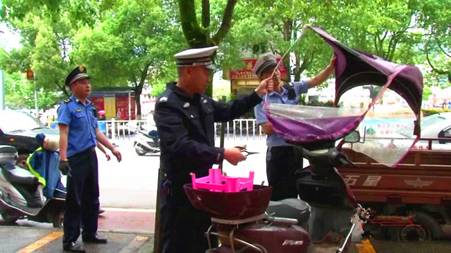 隨著氣溫逐漸升高和雨季的來臨,近期,我縣城區摩托車、電動車非法加裝遮陽傘上路行駛的現象又有所抬頭。結合掃黑除惡心治亂工作,為了預防和減少交通事故發生,連日來,我縣相關部門對機動車輛非法加裝遮陽雨傘棚現象進行了集中整治行動,維護城區交通秩序,營造良好道路交通環境,助力我縣省級文明縣城創建工作。