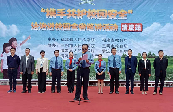 為了預防未成年人違法犯罪,提高未成年人法治意識和自護能力,增強學生的法制意識和遵紀守法的自覺性,10月24日,“法治進校園”省級巡講團到清流縣嵩口中心小學開展“攜手共護校園安全”活動。 在活動開幕式上。省檢察院檢察官李秋明、清流縣檢察院檢察長董新等分別講話;省檢察院為嵩口中心小學贈送法治宣傳材料。