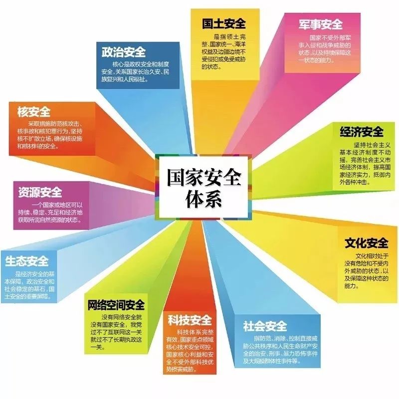 國家安全工作應(yīng)當(dāng)堅(jiān)持總體國家安全觀,以人民安全為宗旨,以政治安全為根本,以經(jīng)濟(jì)安全為基礎(chǔ),以軍事、文化、社會(huì)安全為保障,以促進(jìn)國際安全為依托,維護(hù)各領(lǐng)域國家安全,構(gòu)建國家安全體系,走中國特色國家安全道路。