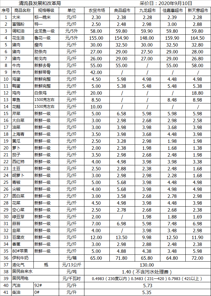 清流縣民生價格行情(采價日:2020.09.10)