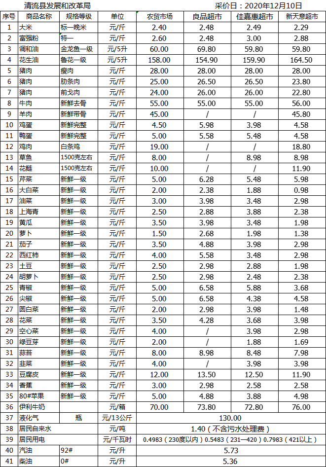 清流縣民生價格行情(采價日:2020.12.10)