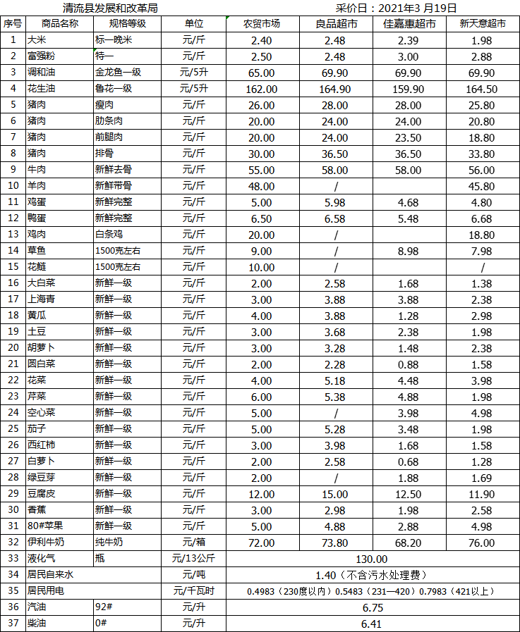 清流縣民生價(jià)格行情(采價(jià)日:2021.03.19)