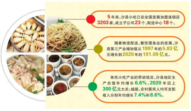 沙縣小吃產業園(楊宗健 攝) “過去需要200至300人同時手工包的蒸餃,現在用自動化設備只需要24個人就能完成,一天可以生產10噸。”中央廚房生產廠長胡寶明感慨。 在產業園另一端的醉有才食品科技有限公司同樣忙碌,作為一家服務沙縣小吃轉型升級的復合醬料生產企業,目前公司日可生產醬料3噸,產品除銷往全國各地小吃業主外,還遠銷英國、美國、菲律賓等7個國家。“這幾年,我們累計已開發了40多款醬料,不僅幫助小吃店實現標準化出餐,還通過伴手禮、小包裝等形式在線上線下銷售,讓更多人足不出戶就能品嘗到沙縣味道。”總經理顏發輝說。 為解決傳統沙縣小吃產品標準不一、產能不足的瓶頸,2019年沙縣啟動小吃產業園一二期及周邊核心區域3500畝食品產業園建設,不斷延伸小吃產業鏈條,已吸引小吃調味品、板鴨休閑食品及禽蛋深加工等10多家關聯企業入駐,年產值可達3.1億元,形成一條龍的沙縣小吃特色食品產業鏈。 在小吃產業園展廳,如今沙縣小吃的主打產品“拌面”“蒸餃”“板鴨”都被做成了伴手禮,進入商超和線上渠道。包括餐具、紙巾、調料等在內,當地已研發出的小吃相關產品1000多個品種。 “如今有約一半的產品可以使用中央廚房提供的半成品,能省下近三分之一的操作時間用來休息與陪伴家人,越來越多的年輕人也因此愿意繼承父輩的小吃店。”沙縣小吃產業發展中心副主任張鑫說。 沙縣小吃產業化發展成為提振經濟的助推器。數據顯示,隨著物流配送、餐飲服務及旅游等第三產業的發展,沙縣第三產業增加值從1997年的5.83億元增長到2020年的101.09億元。 提升:數字化引領轉型 門店實時銷售額、菜品銷售排名、區域小吃門店數……在沙縣小吃產業園內,一塊兩人多高的電子屏幕上,實時更新著1600多家沙縣小吃店所在省份、時間段、產品的銷售情況。 2019年以來,沙縣開始啟動小吃數字化建設,引導人流、資金流、數據流回歸,已在北京等6個城市進行數字化經濟試點,1600多家門店數據回流沙縣總部。在此基礎上,今年,沙縣小吃集團在供應鏈配送、倉儲分揀、客戶端等層面進行了升級改造,在深圳試點期間日訂單量超過1000單,日營業額在30萬元左右。 “新系統主要解決食材供應鏈前后端暢通問題,試點期間各門店食材成本平均降低20%以上。”沙縣小吃產業發展中心數字辦主任謝建海介紹,目前平臺已逐步向全國沙縣小吃標準門店推廣。 通過互聯網技術與新零售的運行業態結合,系統一端源源不斷地將供應鏈、收銀、營業額等數據匯集回沙縣,另一端的商家也已開始享受數字化帶來的紅利。 在位于深圳市羅湖區的沙縣小吃99號店內,忙碌了一天的店主魏欽明拿出手機,在信息化平臺上下單了面干、雞腿、老壇酸菜醬等隔天店鋪需要的菜品。 “品種多,明碼標價,經常還有優惠促銷活動,比自己去市場采購價格還低。”魏欽明在深圳經營小吃多年,如今這樣方便快捷的配送體系讓他很滿意。“過去開店,生意好的店鋪要備兩三臺冰箱,調料經常一備就是10多件,就怕突然沒貨了。現在就算只買一袋面干也免費送貨上門,真的非常方便。” 如今在深圳,像魏欽明一樣享受到數字化配送福利的小吃店已超過2000家。