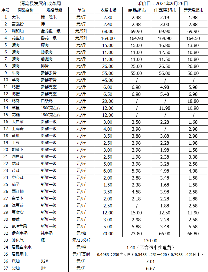 清流縣民生價格行情(采價日:2021.09.26)