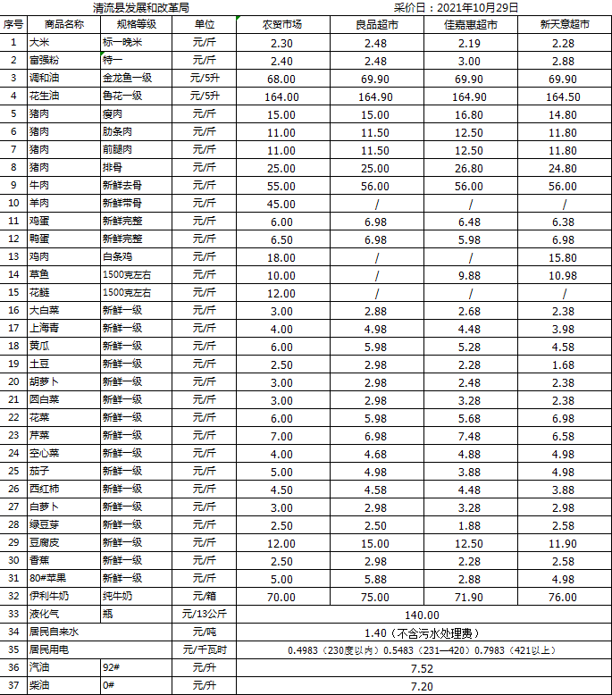 清流縣民生價格行情(采價日:2021.10.29)