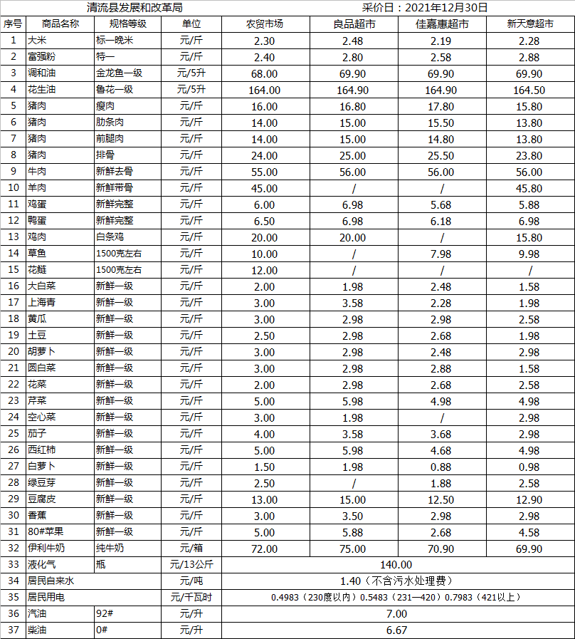 清流縣民生價格行情(采價日:2021.12.30)
