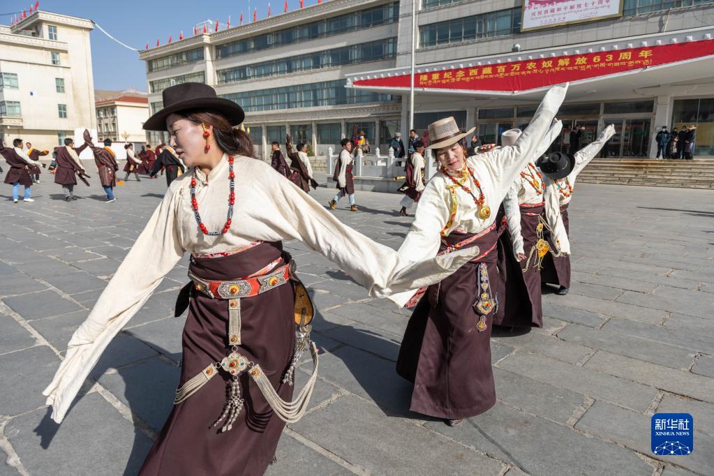 3月28日,那曲市群眾在慶祝活動上跳起鍋莊舞。 當日,西藏那曲市舉行活動,慶祝西藏百萬農奴解放紀念日。 新華社記者 周荻瀟 攝