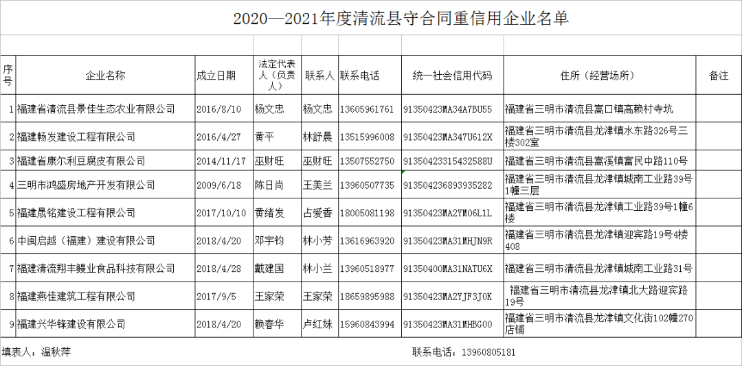 為進一步推動我縣企業信用體系建設,營造良好的市場經濟秩序,2022年3月,縣市場監督管理局組織開展了“2020-2021年度清流縣守合同重信用企業”創建活動。經企業自主申請、各市場監管所初審推薦、縣市場監管局審核等程序,并征詢法院、縣稅務局、縣人社局、駐縣生態環境局、縣住建局、縣應急局、人行清流支行、縣工信局等部門的審核意見,認為福建省清流縣景佳生態農業有限公司等9家企業(詳見附件)符合“2020-2021年度清流縣守合同重信用企業”申報相關標準。我局現將企業名單予以公示,歡迎社會各界對其中存在不守信行為的企業進行檢舉。 公示時間:2022年5月6日-2022年5月14日 聯系電話:0598-8705056 附件:2020-2021年度清流縣守合同重信用企業名單