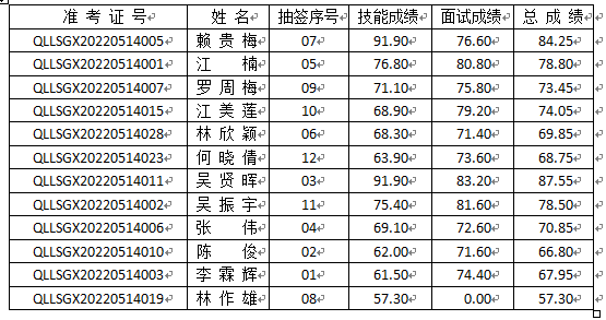 根據4月26日發布的《清流縣糧食購銷有限公司招聘公告》和我司5月10日發布的《清流縣糧食購銷有限公司招聘技能測試和面試通知》,5月14日上午共有19位應聘人員參加了技能測試(理論+體能),按1:3的比例共篩選出12名(男女各6名)應聘人員參加了5月14日下午的面試。現將總成績公示如下: