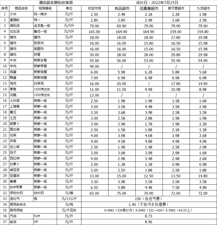 清流縣民生價格行情(采價日:2022.07.25)