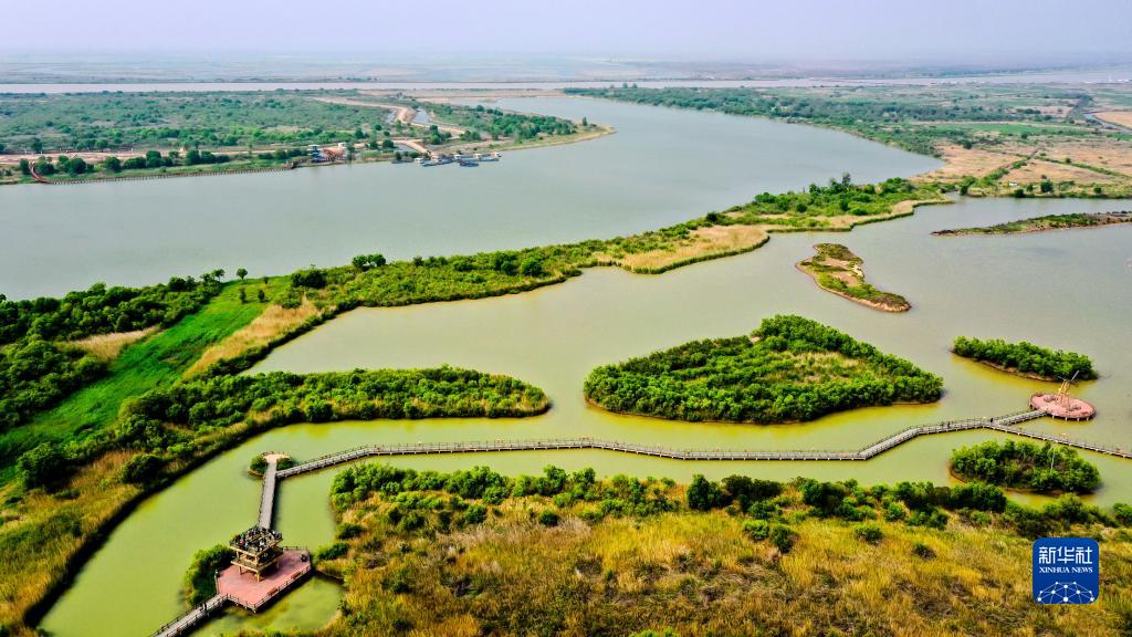 山東黃河三角洲國家級自然保護區景色(2021年5月13日攝,無人機照片)。 山東省東營市有近海與海岸濕地、河流濕地、湖泊濕地、沼澤濕地、人工濕地等5類14型濕地,濕地率41.58%。其中,山東黃河三角洲國家級自然保護區,是中國暖溫帶最廣闊、最完整、最年輕的濕地生態系統。2018年,東營市被評為全球首批“國際濕地城市”,并形成了“藍綠交織、清新明亮,濕地在城中、城在濕地中”的城市特色。 新華社記者 郭緒雷 攝