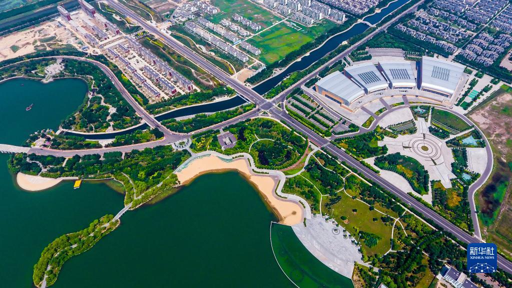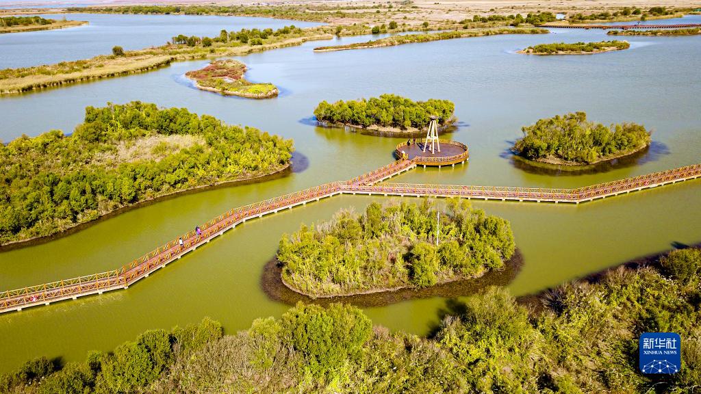 東營市墾利區民豐湖公園景色(2018年6月24日攝,無人機照片)。 山東省東營市有近海與海岸濕地、河流濕地、湖泊濕地、沼澤濕地、人工濕地等5類14型濕地,濕地率41.58%。其中,山東黃河三角洲國家級自然保護區,是中國暖溫帶最廣闊、最完整、最年輕的濕地生態系統。2018年,東營市被評為全球首批“國際濕地城市”,并形成了“藍綠交織、清新明亮,濕地在城中、城在濕地中”的城市特色。 |