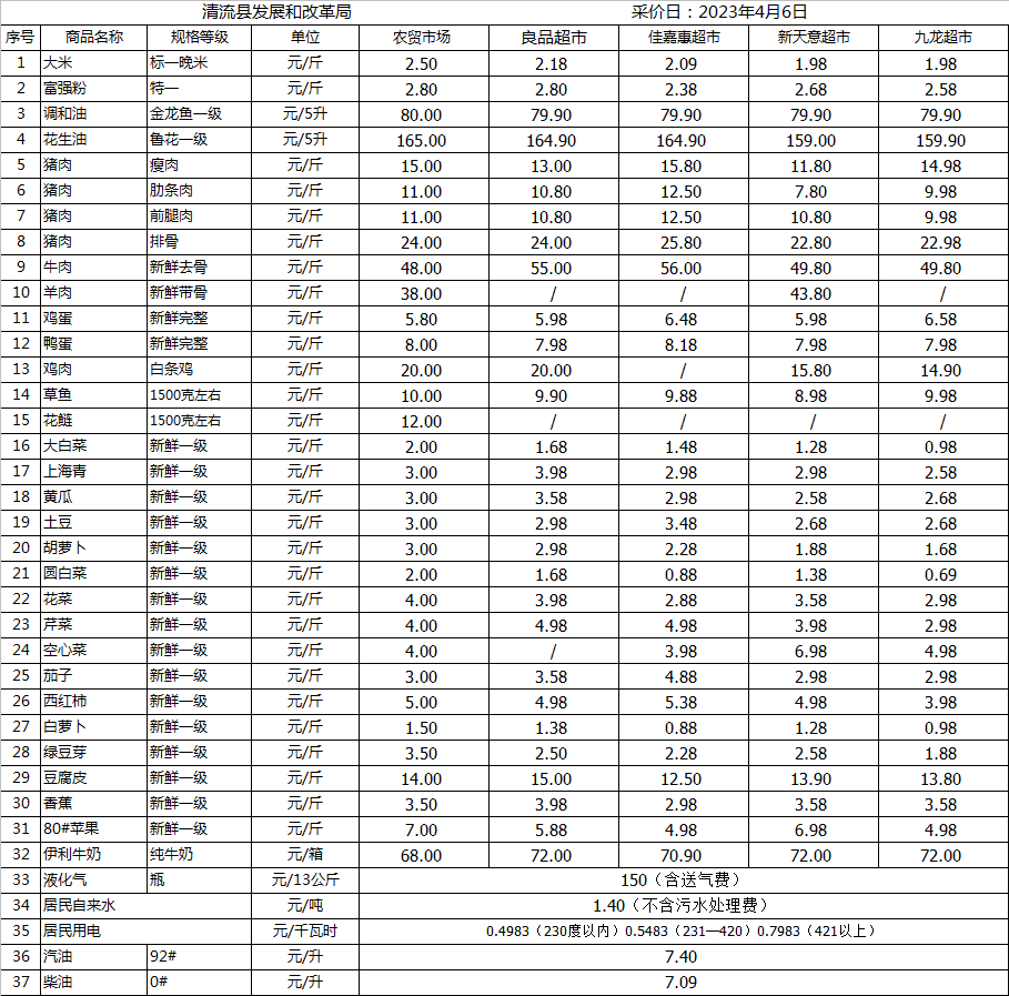清流縣民生價格行情(采價日:2023.04.06)