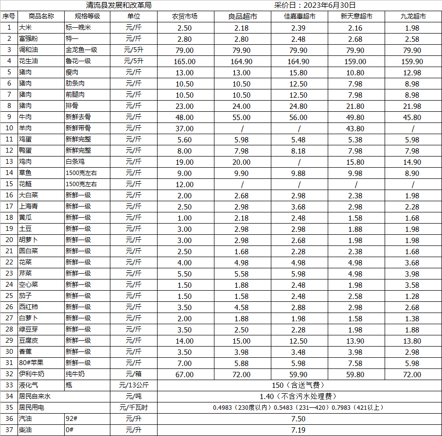 清流縣民生價格行情(采價日:2023.06.30)