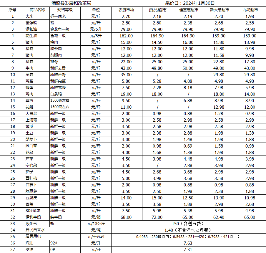 清流縣民生價(jià)格行情(采價(jià)日:2024.01.30)