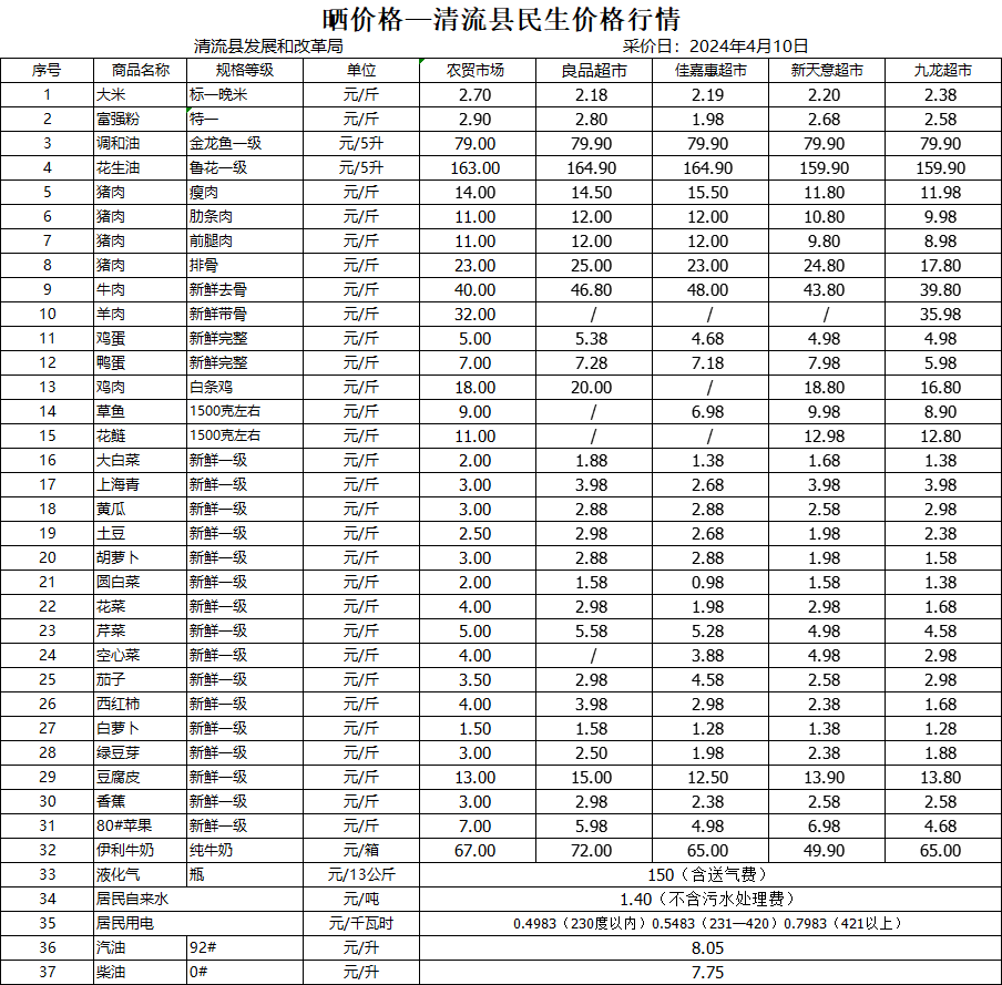 清流縣民生價格行情(采價日:2024.04.10)