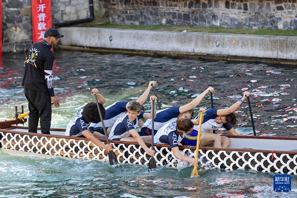 5月24日,在德國法蘭克福,龍舟隊隊員與岸上觀眾互動。 為迎接中國傳統(tǒng)節(jié)日端午節(jié),海外多地近日舉行龍舟比賽等活動,讓民眾體驗到多元文化交融的魅力。 新華社記者 張帆 攝