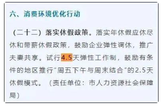 四川綿陽(yáng)官宣試行4.5天彈性工作制 官方回應(yīng):并非強(qiáng)制 近日,四川省綿陽(yáng)市商務(wù)局印發(fā)《綿陽(yáng)市提振消費(fèi)專項(xiàng)行動(dòng)2025年工作清單》,旨在全面提升居民消費(fèi)能力和市場(chǎng)活力。 《工作清單》提出開(kāi)展七大核心行動(dòng),包含29條具體措施,涵蓋了收入、教育、養(yǎng)老、住房、賽事、夜經(jīng)濟(jì)、休假等多個(gè)方面。備受關(guān)注的落實(shí)休假政策中提到,落實(shí)年休假應(yīng)休盡休和帶薪休假政策,鼓勵(lì)企業(yè)彈性調(diào)休,推廣夫妻共享。試行4.5天彈性工作制,鼓勵(lì)有條件的地區(qū)推行“周五下午與周末結(jié)合”的2.5天休假模式。