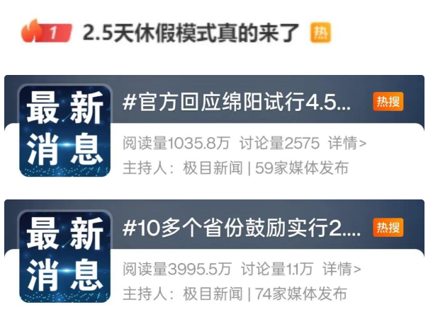 近日 四川綿陽(yáng)宣布 試行4.5天彈性工作制 鼓勵(lì)2.5天休假模式 相關(guān)話題沖上社交平臺(tái)熱搜第一