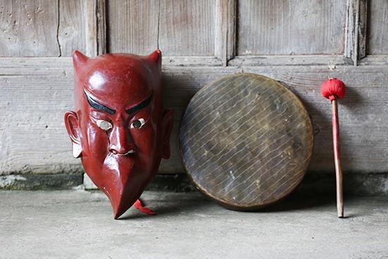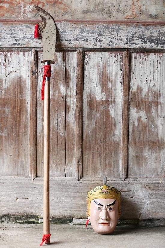 李廣面具和法器 五經魁表演中的5個人物分別是:雷震子、鐘馗、包拯、寇準、李廣。他們有各自的臉譜、服飾、道具。 雷震子,紅臉鷹嘴,身著紅色彩衣,手執銅鑼與九節鑼錘;鐘馗,青面獠牙,眼似銅鈴,身著綠色衣裙,手握鐵筆;包拯,黑臉長須,身著黑袍,手搖鐵骨綢扇;寇準,黃臉長須,身著黃色蟒袍,手持龍頭拐杖;李廣,清秀白臉,身著黃金甲胄,手揮大刀。扮演他們的理由是:雷震子輔助周文王興兵伐紂,救民于倒懸;鐘馗捉鬼除妖,消除人間鬼魅禍害;包拯伸張正義,不畏權勢,鐵面無私;寇準剛直不阿,力排眾議,促成宋真宗抗擊強遼入侵;李廣掃蕩外寇,保衛國土,威震邊陲。制作者根據這五個不同歷史人物的不同性格,制作了五個不同的臉譜面具,穿著不同的服飾并設計了不同的舞蹈動作進行表演。演出隊伍由10人分兩組組成,每兩人扮演同一角色,行走時隊列成兩列或一列,人物排序規矩明確,雷震子鳴鑼開道,后面跟著手舞足蹈的鐘馗,隨后是面容嚴肅的包拯和舉止端莊的寇準,李廣則舞動大刀居后壓鎮,另一組5人也依此序排列。