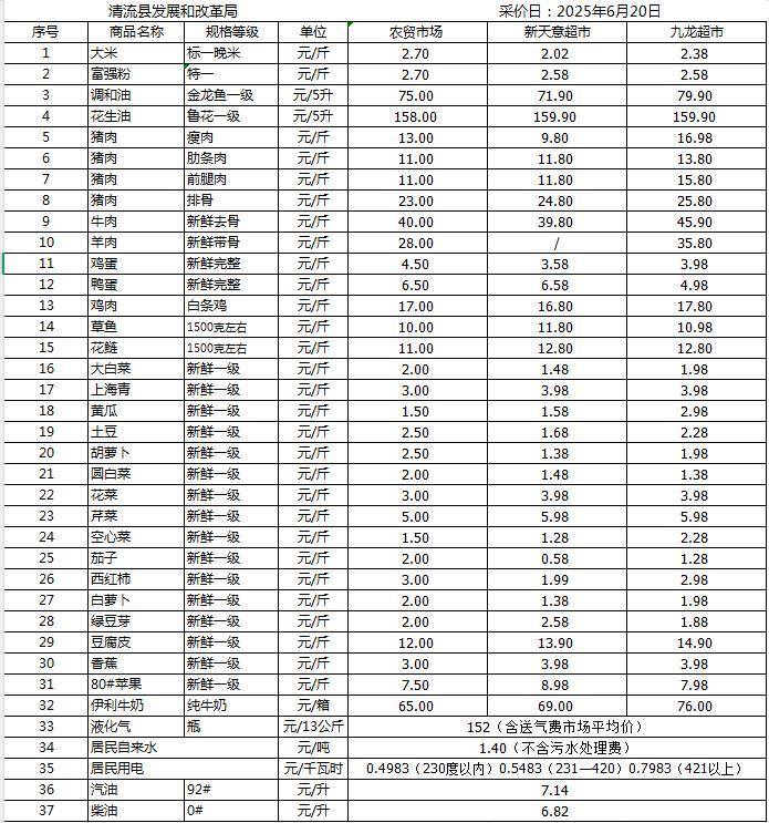 清流縣民生價格行情(采價日:2025.06.20)