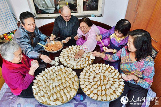 圖為呼和浩特市清泉街社區(qū)的少數(shù)民族居民圍坐在一起包餃子:“生活在這個社區(qū)的各族群眾之間和諧團結(jié),大家將心比心以心換心,親如一家心連心。”(資料圖)